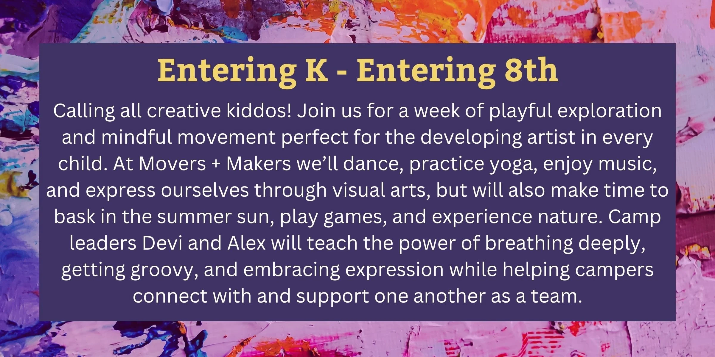 Movers + Makers is hosted by camp leaders Devi Hadsell and Alex Sharry, facilitators with 20+ years combined experience guiding kids of all ages.